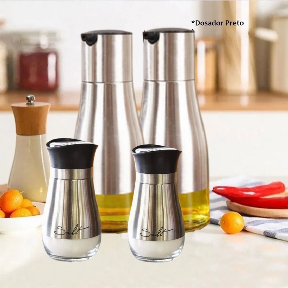 - Vidro, assim facilita a visualização do interior e tampas plásticas, acondicionado em um lindo suporte de metal recoberto de aço inox escovado.